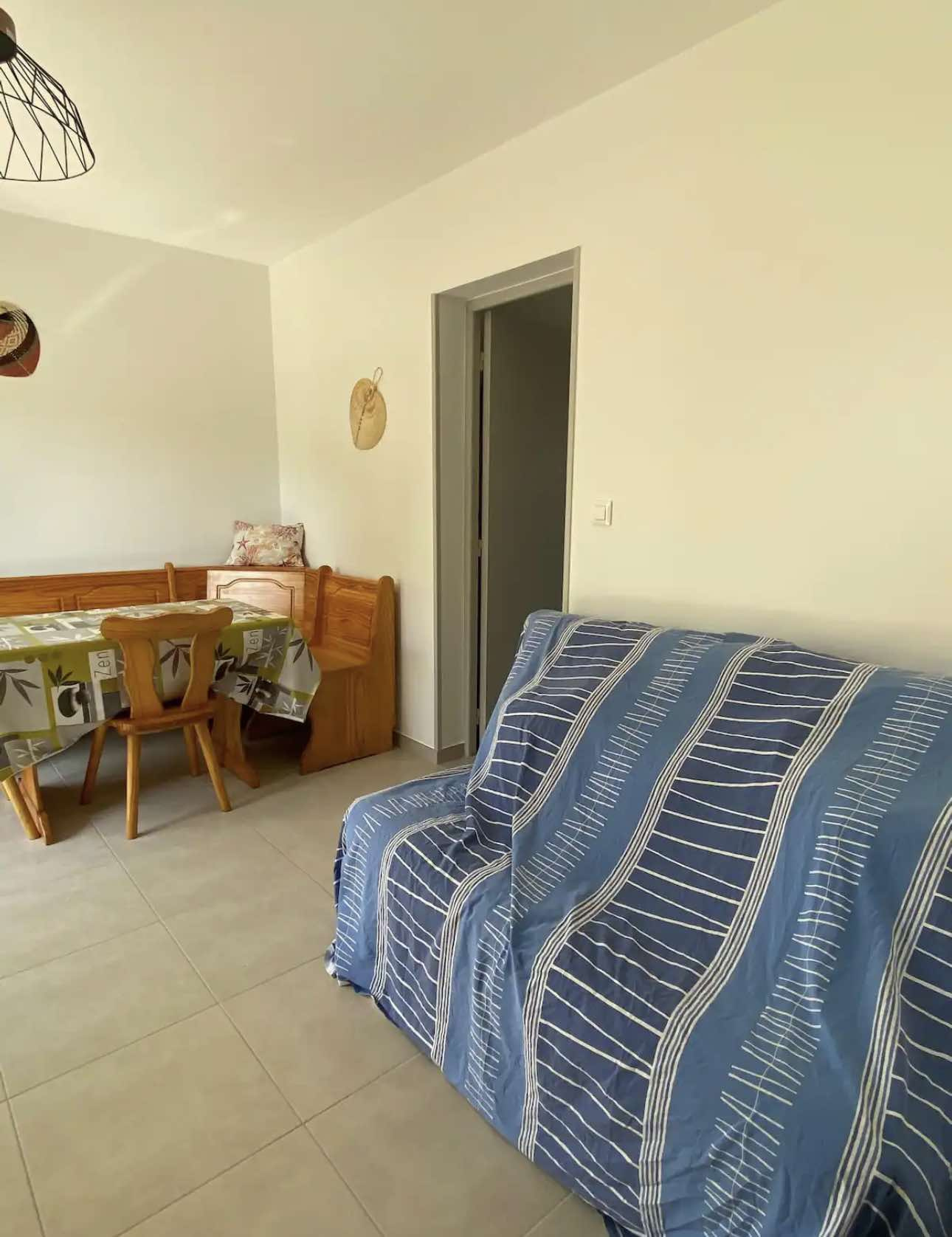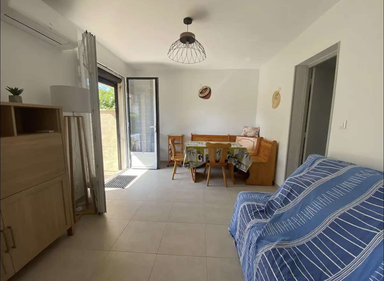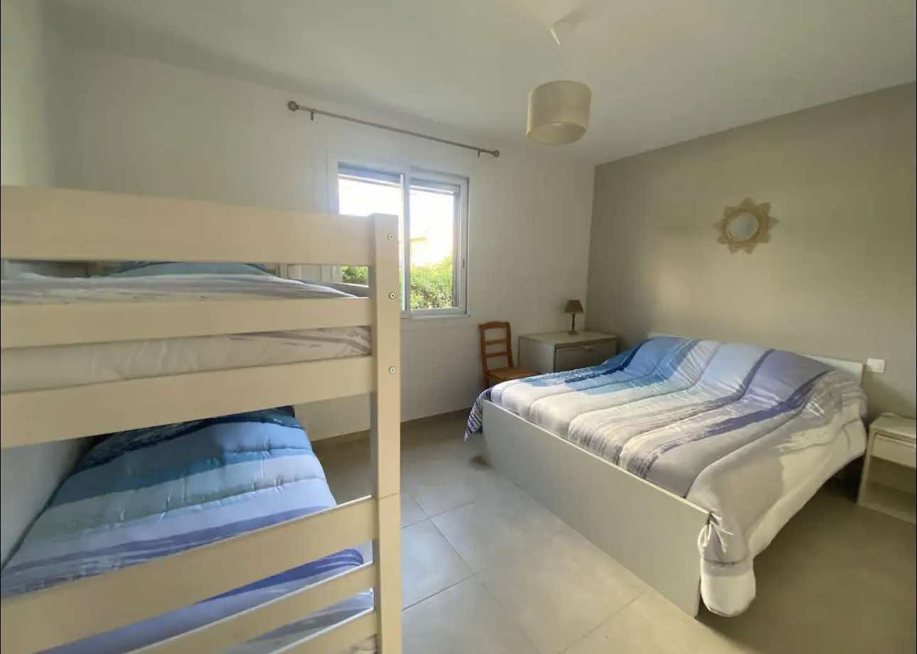 Superbe appartementclimatisé 5 places entièrement rénové en rez de jardin à 100m de la plage avec place de parking , se composant d'une chambre avec un lit en 140 et 2 lits superposés en 90 et d'un canapé lit dans le salon, d'une salle d'eau, d'une pièce à vivre et d'une cuisine équipée d'un lave vaisselle .