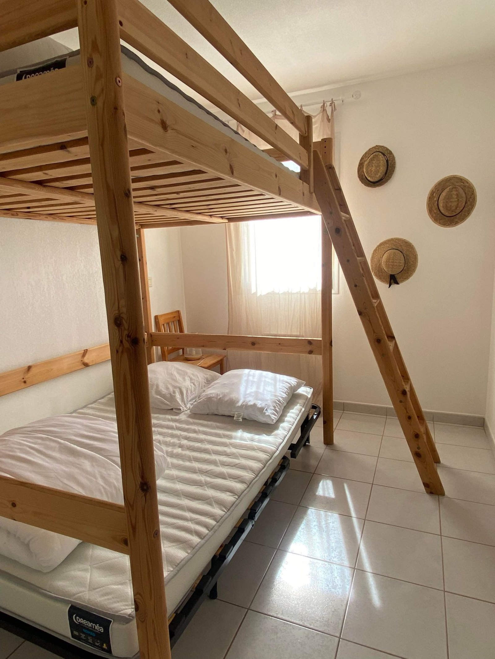 Le pavillon se compose d'une chambre au rez de chaussée avec 1 lit en 140, d'une pièce à vivre cuisine/salle à manger, dune salle d'eau et wc séparé et à l'étage une mezzanine avec 2 lits en 140 .