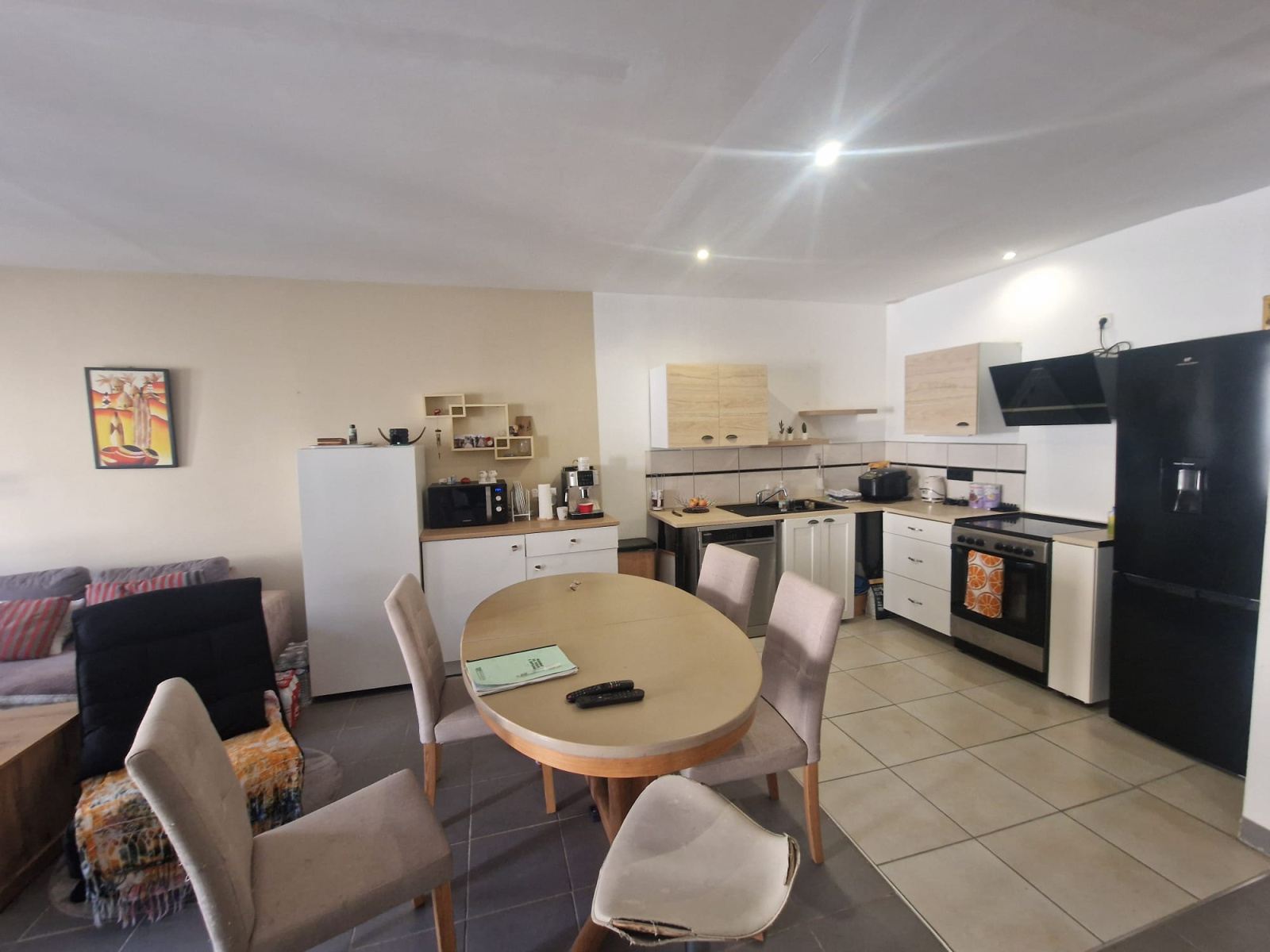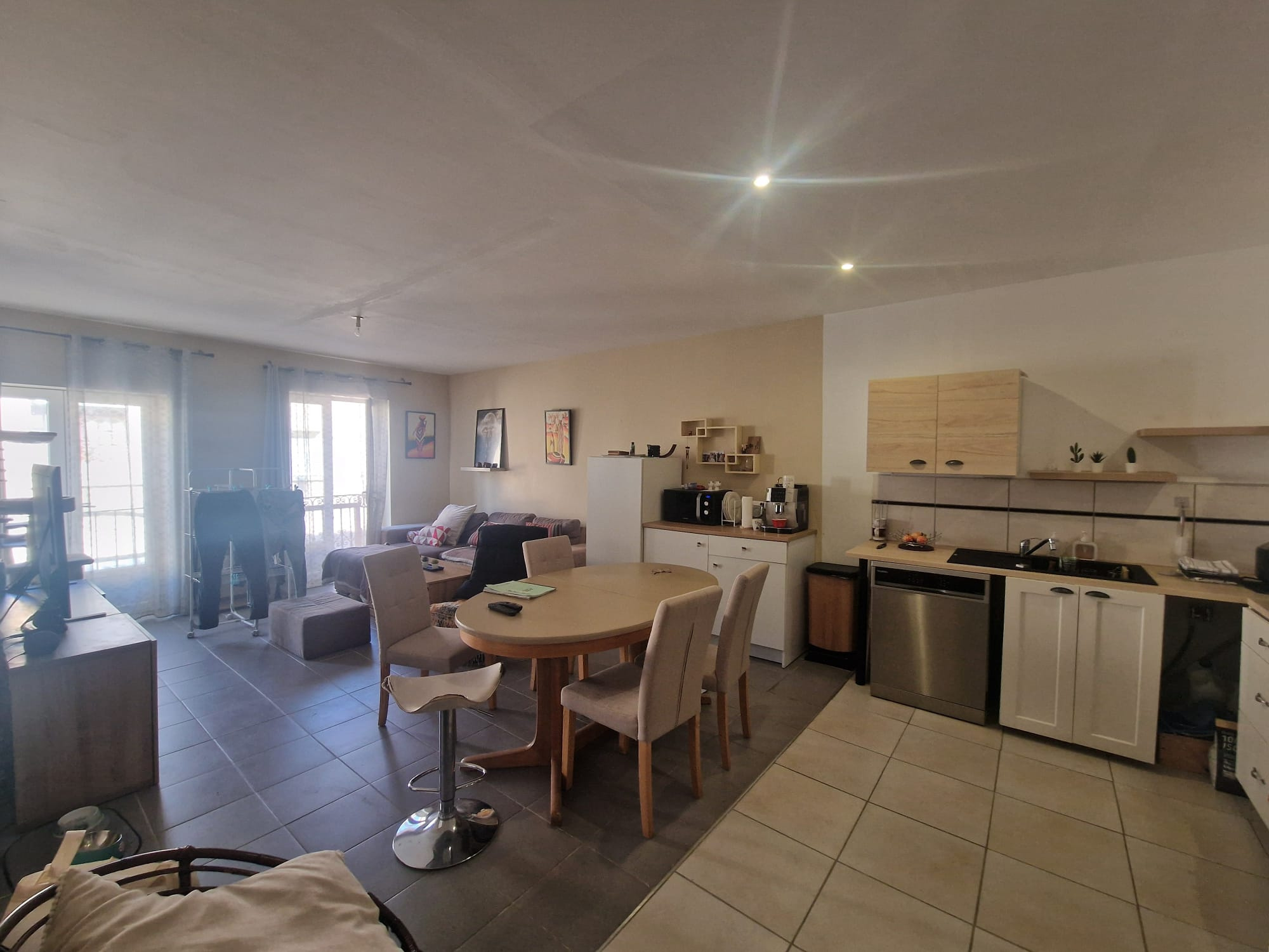 Au premier étage, vous découvrirez une pièce de vie lumineuse comprenant une cuisine américaine équipée ouverte sur le salon, idéale pour partager des moments conviviaux.
